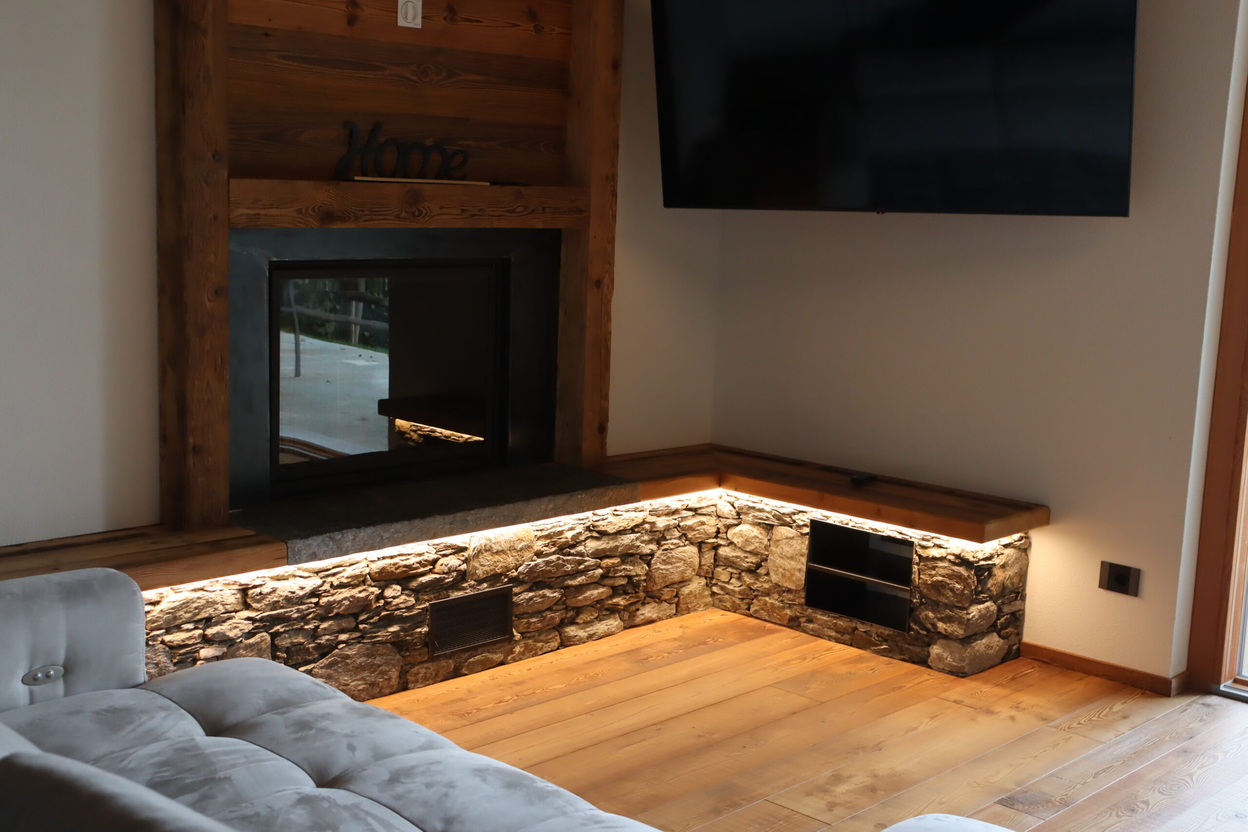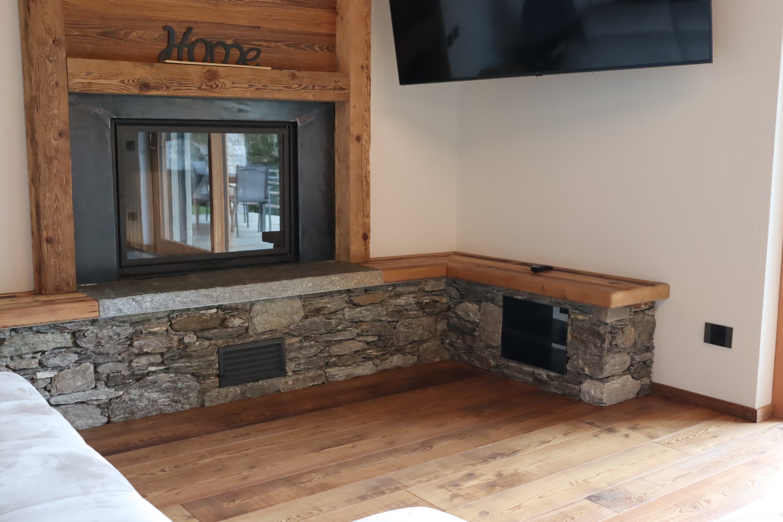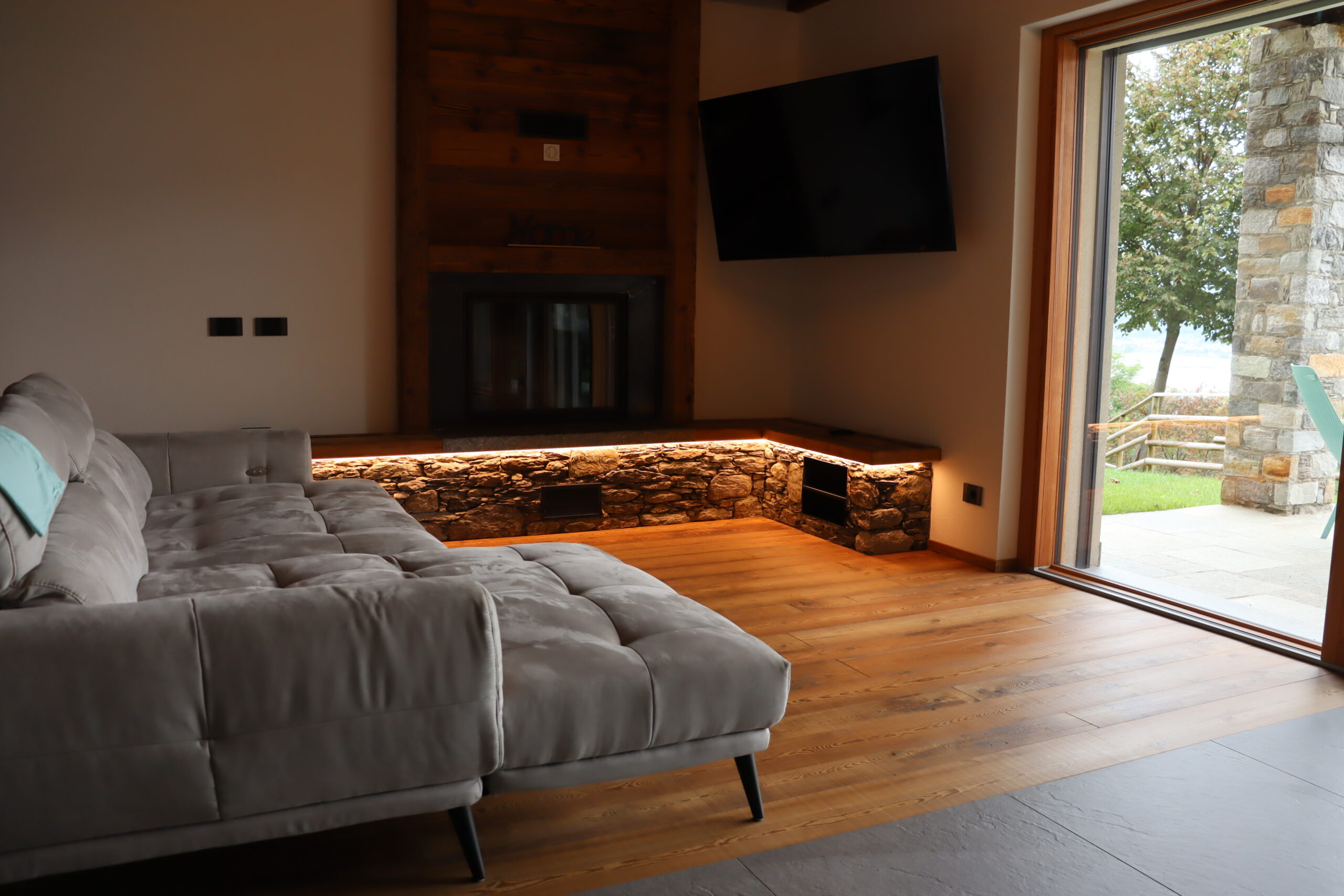 Davanti al camino è stata posizionata una soglia di Luserna, funzionale a trattenere lo sporco nella parte frontale e a proteggere la zona più esposta, mantenendo un aspetto pulito e ordinato nel tempo.